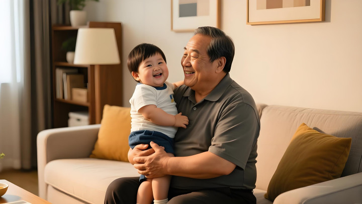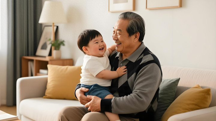 爷爷整天抱着不肯撒手,一口一个“大胖小子有福气”、“头大脑足,将来肯定聪明”。